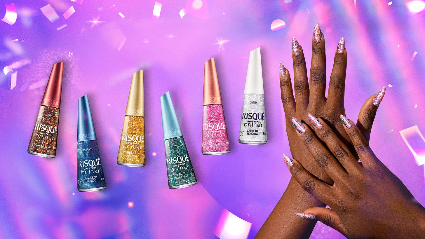 Risqué, marca líder de esmaltes do grupo Coty, reapresenta a coleção "Livre Para Brilhar". Pela primeira vez, a marca inclui uma coleção como parte permanente de seu portfólio, atendendo à crescente demanda por produtos que trazem brilho e personalidade. Com esse relançamento, aumenta sua oferta de glitter na linha fixa, que até então contava com duas opções, Mil Purpurinas e Granulado Rosé.