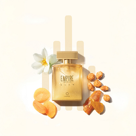 A embalagem de Empire Woman Glam traz a cor dourada, símbolo de sofisticação, força e determinação, refletindo a personalidade da mulher que é protagonista da sua própria história. O frasco é um verdadeiro reflexo da mulher que a fragrância deseja representar: destemida, elegante e poderosa.