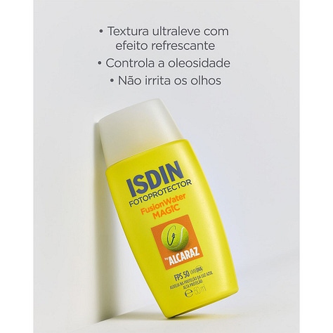ISDIN, marca de Barcelona referência em dermocosméticos, traz ao Brasil Fusion Water Magic Alcaraz, protetor solar facial que tem o aval de Carlos Alcaraz, grande estrela do tênis mundial. Com textura ultraleve, absorção imediata, efeito refrescante, resistente ao suor, FPS 50, não deixa resíduos, não arde os olhos, controla a oleosidade e promove proteção contra a degradação de colágeno, sendo ideal para atividades físicas ao ar livre com exposição prolongada ao sol.