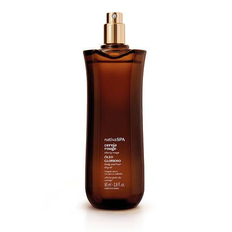 O Óleo Glorioso Nativa SPA Cereja Rouge possui toque seco e pode ser usado no corpo e nos cabelos. O exclusivo acorde Sexy Cherry traz os aspectos licorosos e suculentos da cereja, em fragrância oriental frutal ambarada, que despertam a sedução, para uma perfumação na máxima potência, sedutora e envolvente. A potência do óleo nutritivo de quinoa aumenta em 77% a produção de colágeno na pele e potencializa o acabamento acetinado do efeito pele de cereja. Produto vegano e cruelty free.