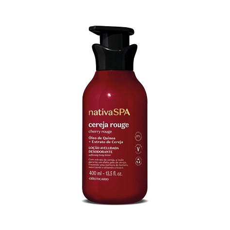A Loção Nutritiva Desodorante Nativa SPA Cereja Rouge possui benefícios poderosos para a sua rotina diária de cuidados corporais. A combinação do óleo de quinoa com o extrato de cereja melhora a textura e firmeza da pele, alisando e suavizando ao toque; O exclusivo acorde Sexy Cherry traz os aspectos licorosos e suculentos da cereja, em fragrância oriental frutal ambarada, que despertam a sedução, para uma perfumação na máxima potência e uma pele sedutora e envolvente. Produto vegano e cruelty free.