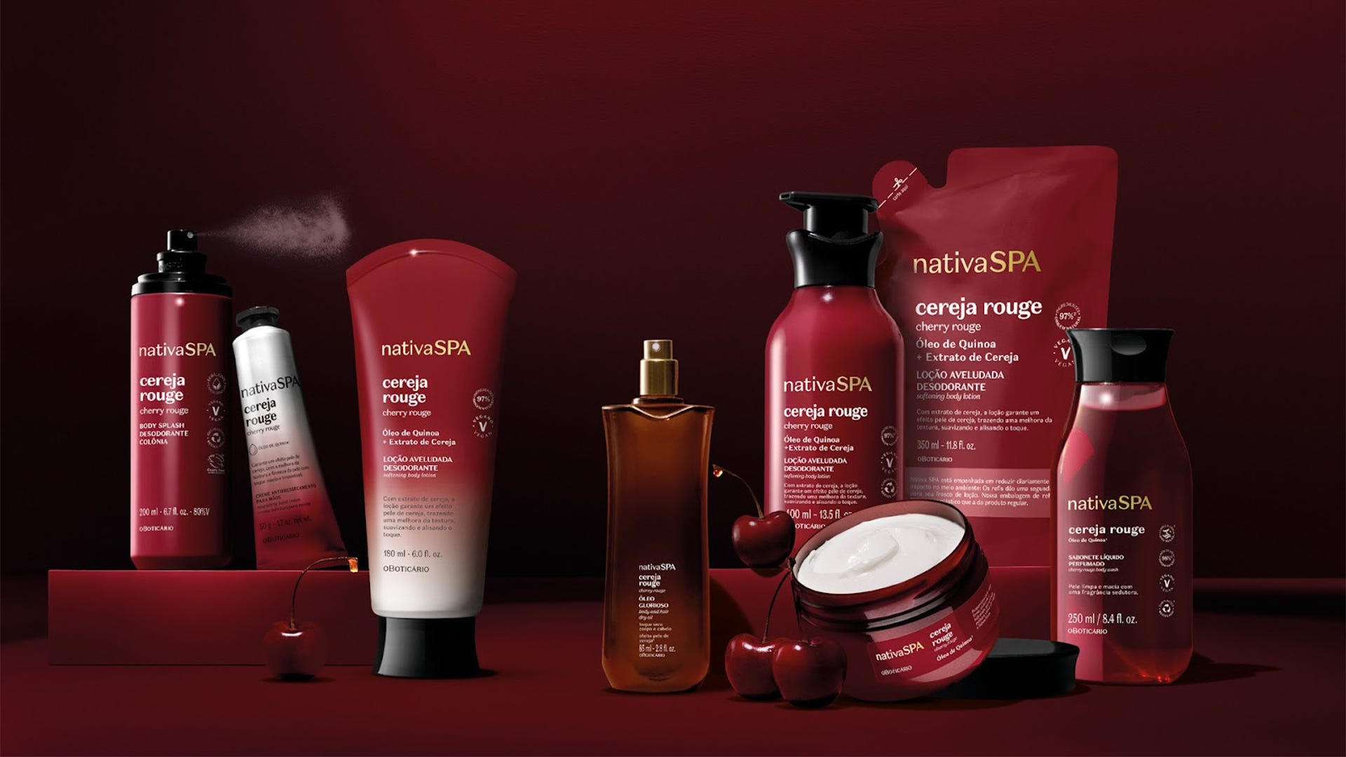 Nativa SPA Cereja Rouge chega para integrar a família de cuidados corporais do Boticário que é conhecida por sua intensa perfumação. O lançamento exala sensualidade e, com o inédito e exclusivo acorde Sexy Cherry, proporciona pele comprovadamente mais irresistível1, com fragrância sensual e instigante. Além do óleo de quinoa, ativo exclusivo e presente em todo o portfólio de Nativa SPA, a novidade ainda conta com o “efeito pele de cereja”, resultado da união do óleo de quinoa com o extrato de cereja, que melhora a textura e firmeza da pele2. Com aspectos licorosos e suculentos da cereja, a linha entrega uma fragrância oriental frutal ambarada, para uma perfumação marcante envolvente, códigos antes únicos da perfumaria internacional, pela primeira vez em uma marca de Corpo & Banho.