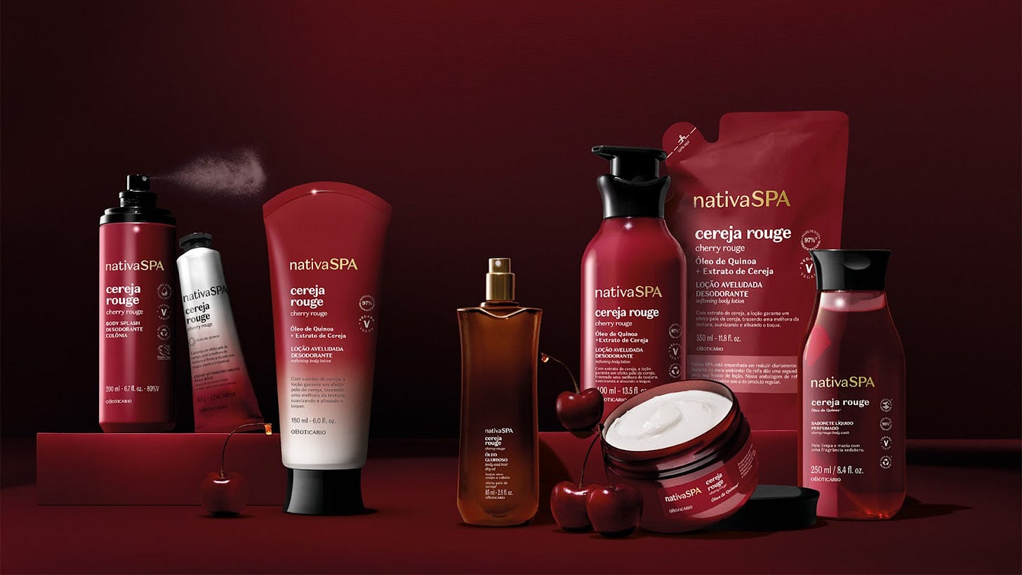 “Nativa SPA já é conhecida por entregar a máxima potência da nutrição e da perfumação e a cereja é naturalmente sensual e sofisticada – o ingrediente ideal para nos inspirar para esse lançamento. Com Cereja Rouge, elevamos a régua da nossa inovação e nos diferenciamos ainda mais do mercado ao trazer para os produtos o exclusivo Acorde Sexy Cherry, que entrega os aspectos licorosos e suculentos da cereja. Pela primeira vez, incorporamos esse importante código do universo da perfumaria internacional para Nativa SPA, o que coloca essa intensidade olfativa já valorizada pela consumidora em um novo patamar”, explica Bruna Nunes, diretora da categoria Corpo & Banho do Grupo Boticário.